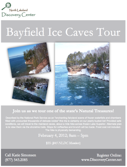 Described by the National Park Service as an "enchanting fairyland scene of frozen waterfalls and chambers filled with uncounted thousands of delicate icicles" this trip is certainly on our yearly bucket list! Provided safe conditions, we will travel to the mainland caves, about a mile hike across frozen Lake Superior. Alternate plan is to view them via the shoreline trails. Stops for coffee/tea and brunch will be made. Food cost not included. The hike is physically demanding.